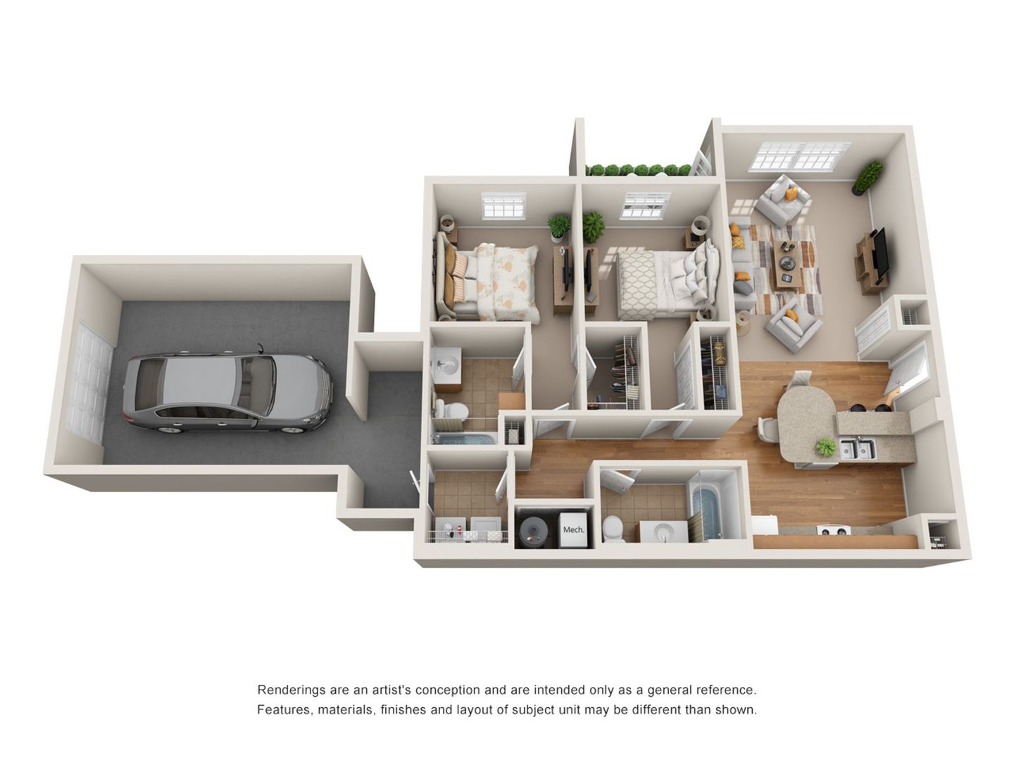 Inviting, open floor plan with built-in dinette area, 9-foot ceilings throughout, and a convenient attached single-car garage. Cherry oak-colored cabinets and white appliances in the kitchen give a natural warmth to the space. Limited lake view options are available for an additional $40/month.
